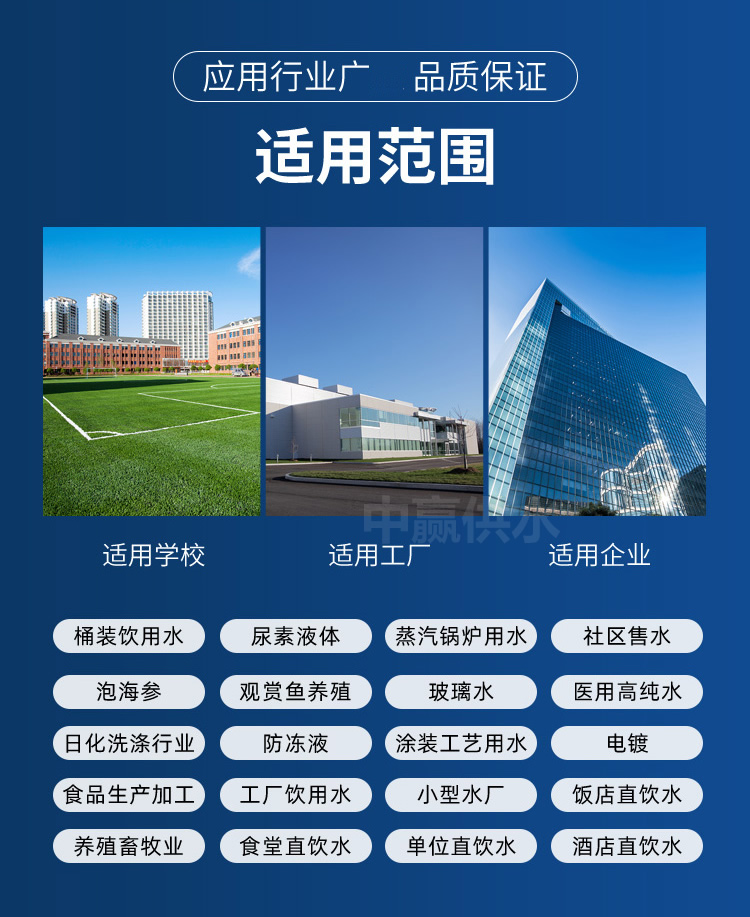 3、后處理部分是對反滲透制取的純水作進一步的深化處理以制取超純水,通常是離子交換混床設備或EDI設備,根據(jù)客戶要求,出水阻率可達到18.2MΩ.CM,如果是應用在直飲水工藝上,則加上殺菌裝置即可,通常為紫外線殺菌器或者臭氧發(fā)生器,從而使生產(chǎn)出來的水達到直飲標準。